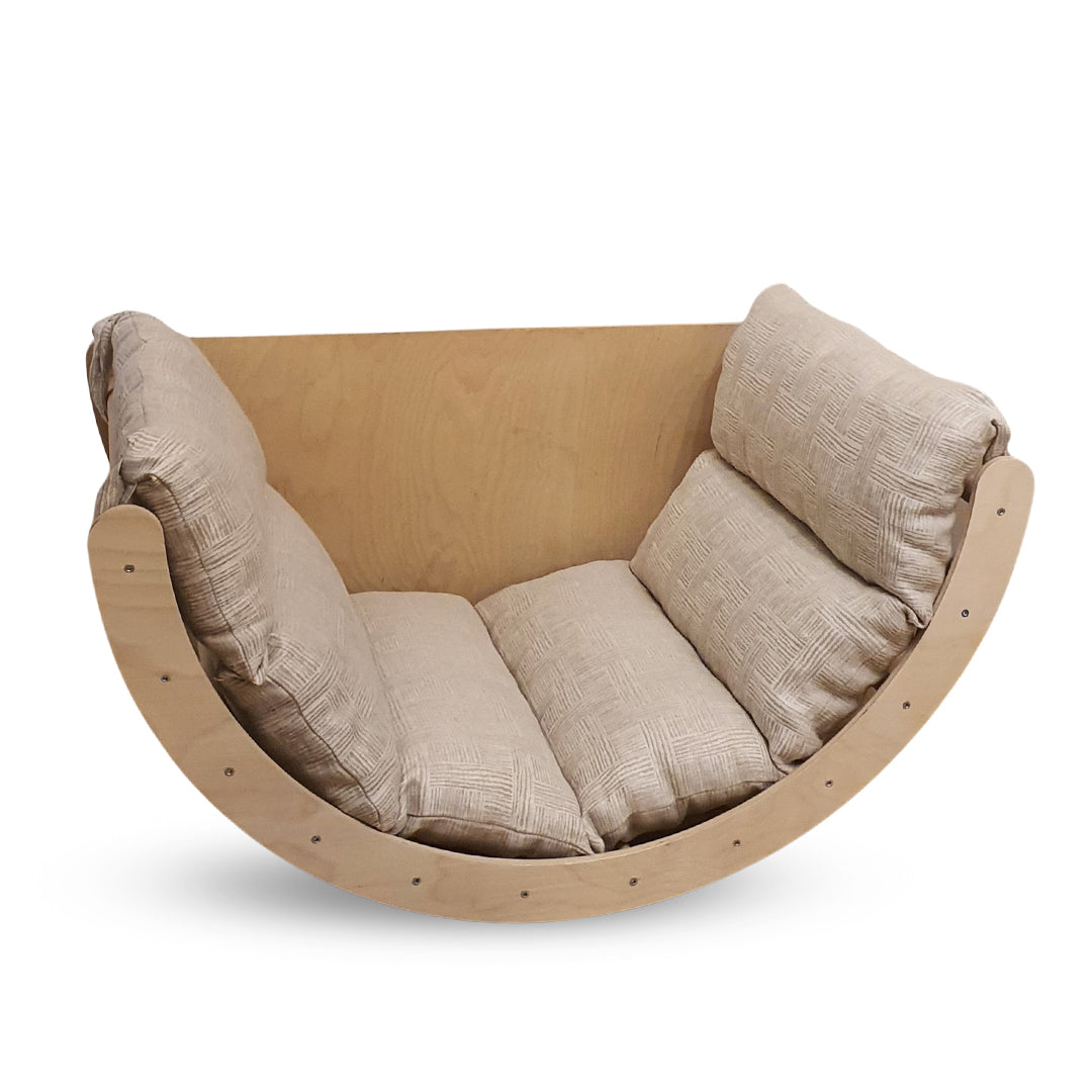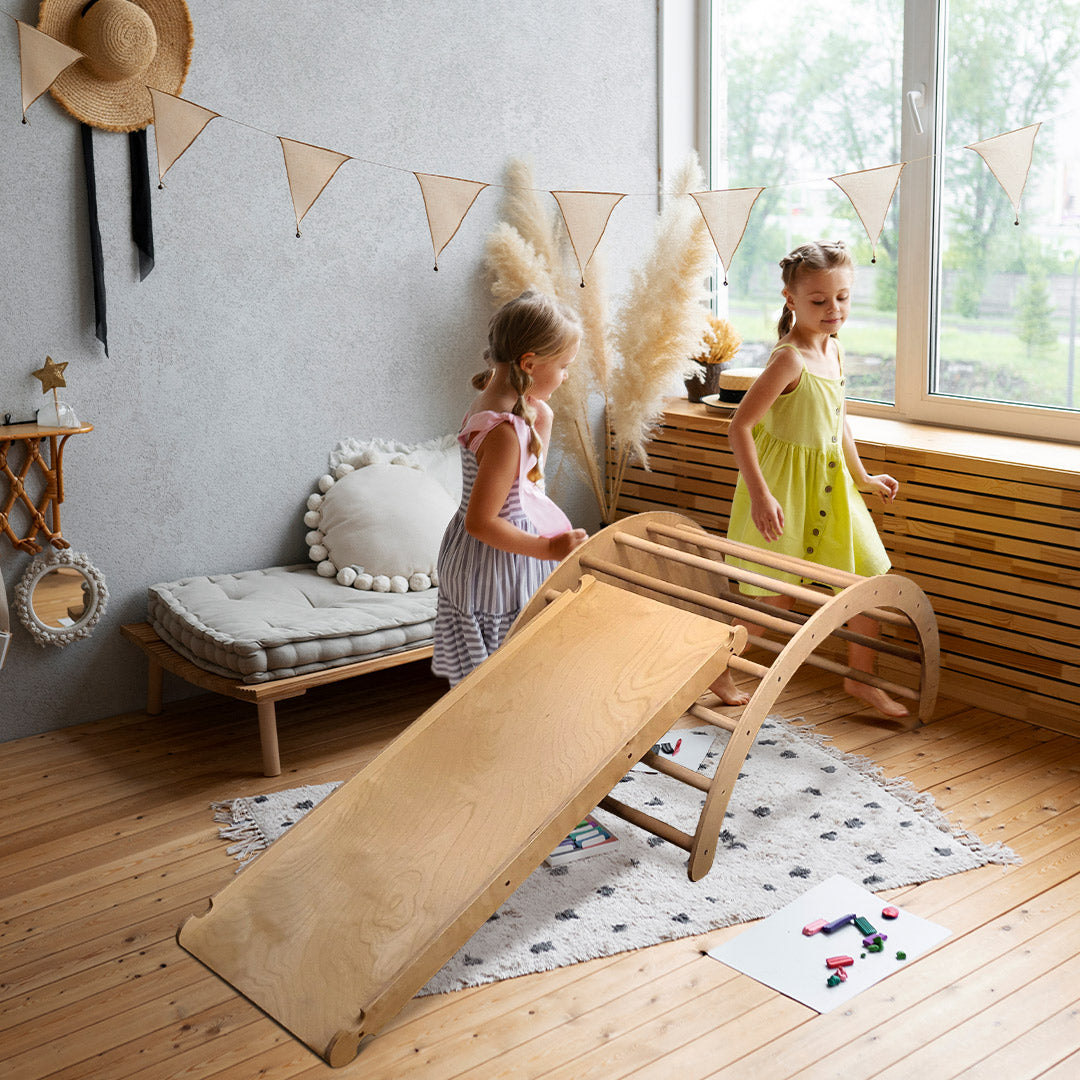 A 2-in-1 climbing and sliding ramp can be added to the arch. And these are just a few of the options! The arch can also be used as a swing-rocker, extremely comfortable with the soft textile cushion. Also, as a mini tent, soccer goal, toy basket (facing the wall) or active gymnastics if you hang hanging toys :)