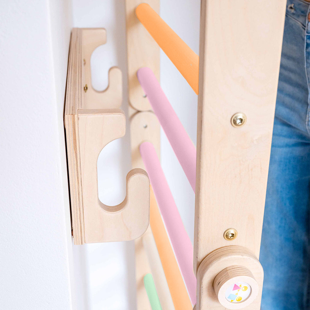 All our climbing sets are designed on a modular system, allowing each element to connect and evolve as your child grows and their interests change. For the Swedish Wall, we use the same wooden ladder modules as our Pikler triangles, complemented with additional attachments and accessories for even more fun. To assemble it as a wall, the three ladders are unfolded at a 180° angle to create one large climbing ladder, which can easily be lifted and hung on the mounted wall bracket.