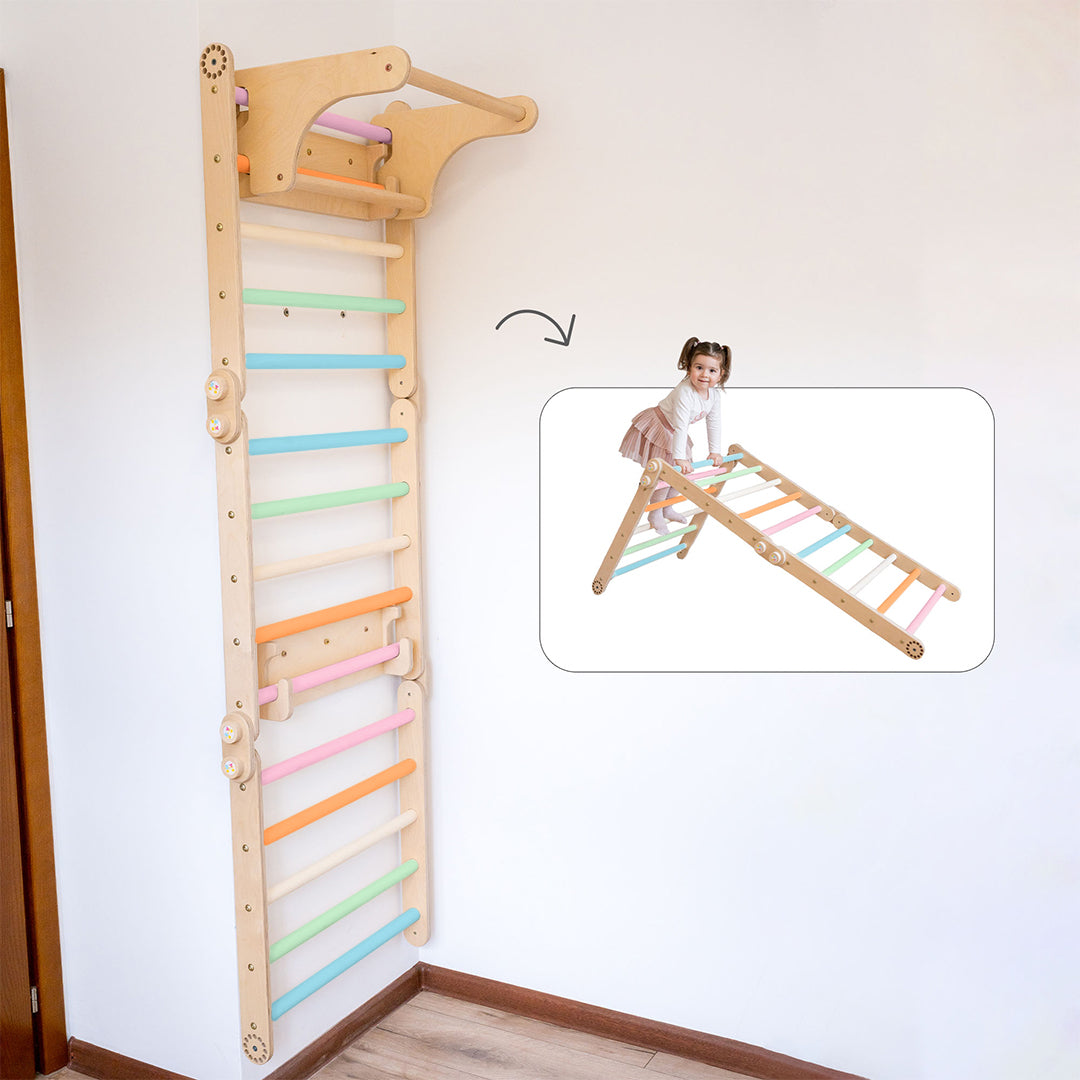 Yes, even the little ones can now have their own home gym! The Swedish Wall is a fantastic way to make playtime more dynamic, focusing on your child’s physical development and muscle strength. Gone are the days of play limited to the floor — thanks to our multifunctional climbing system that transforms from a Swedish wall into a floor climber and back, children can now reach new heights safely and comfortably at home.