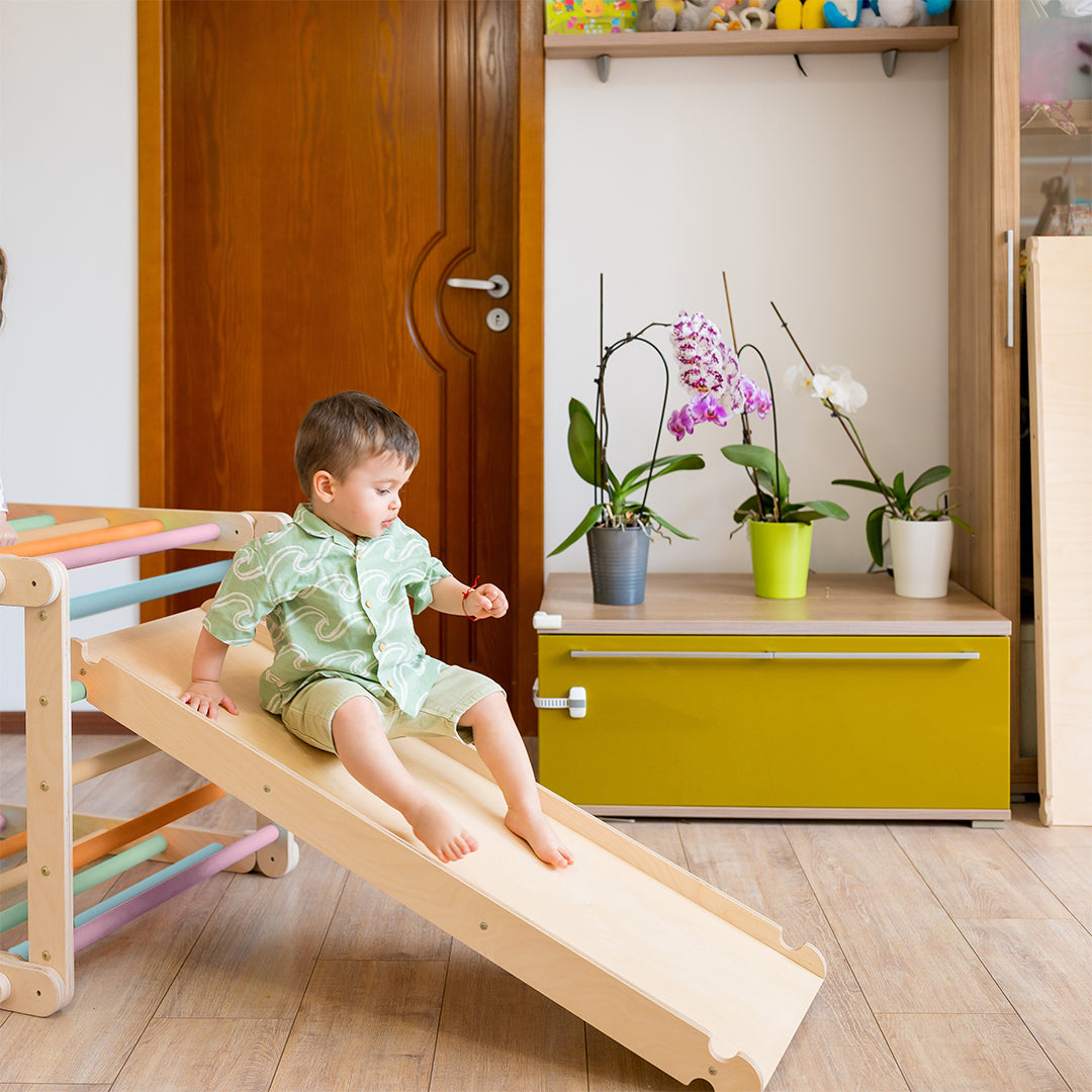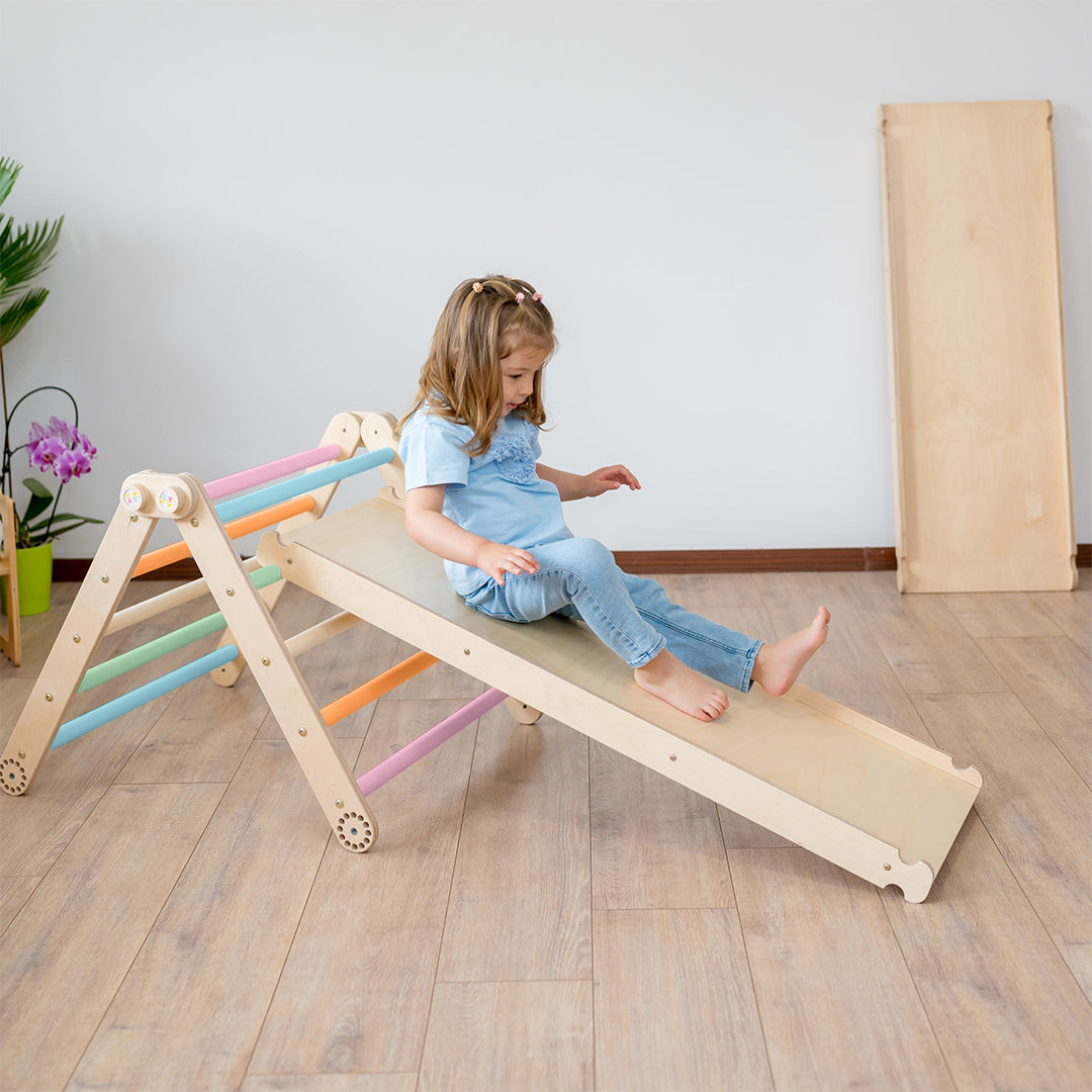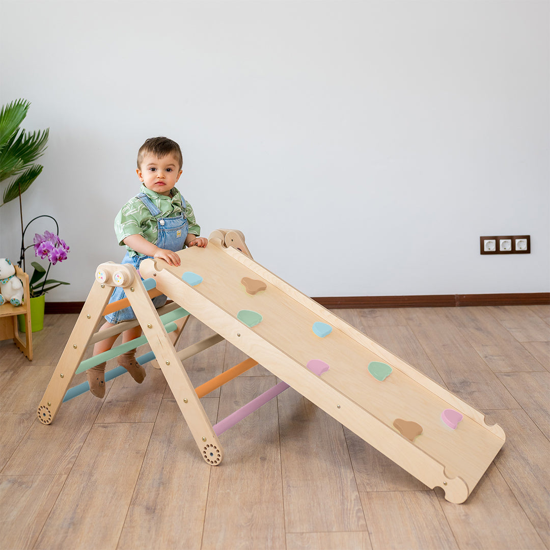- Versatile Design: Transform your Montessori Climbing Triangle into a multifunctional play area with this double-sided ramp, allowing children to climb, slide, and explore from multiple angles. You can control the steepness by moving it up and down the triangle rods.